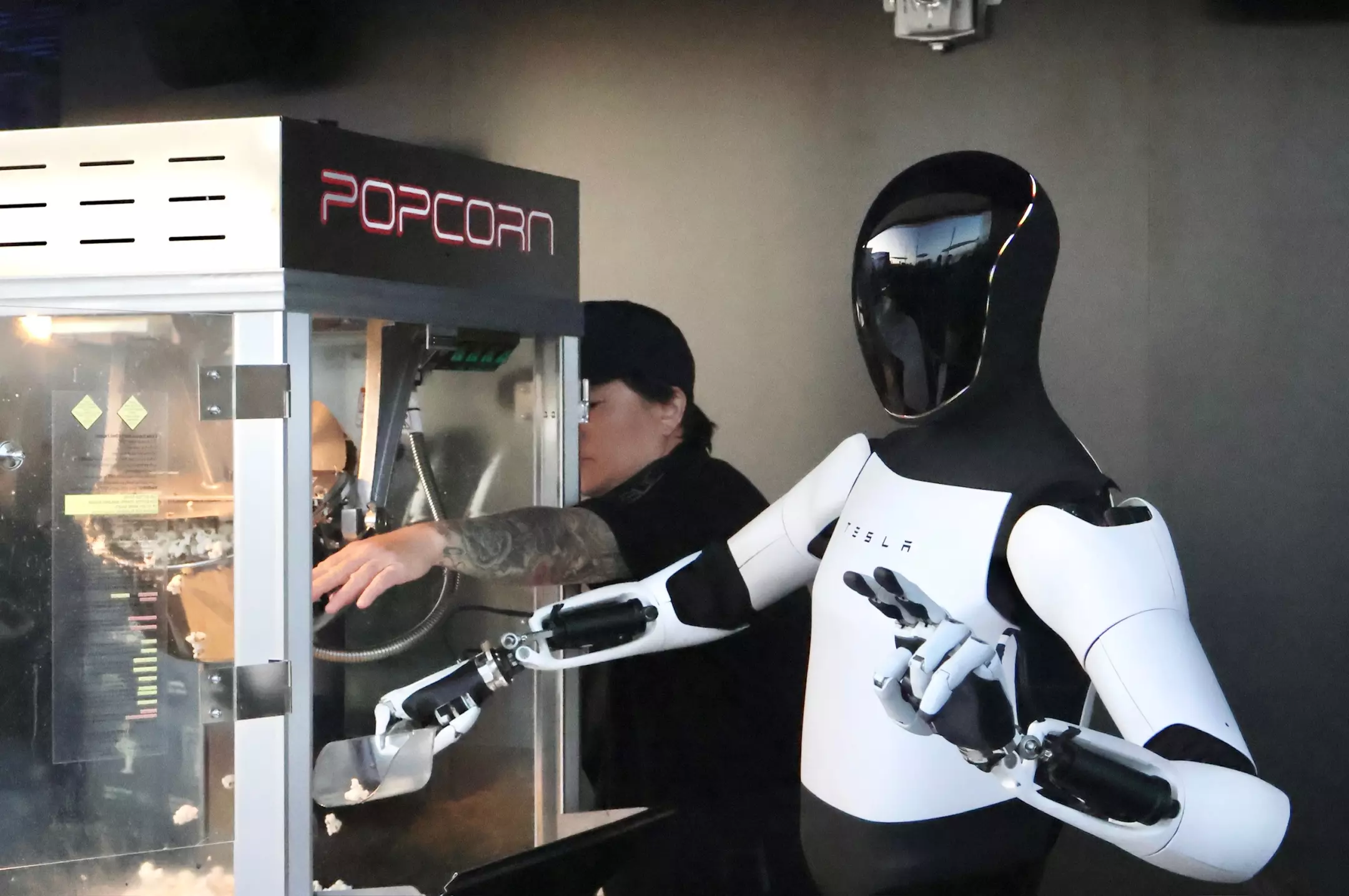 Restoranın otoparkındaki dev ekranlar, araç şarj edenlere açık hava sinema keyfi sunuyor. Çatı katı ise Optimus robotlarının sergilendiği bir alan olarak tasarlanmış. Hatta patlamış mısır standını bir Optimus robotu işletiyor!